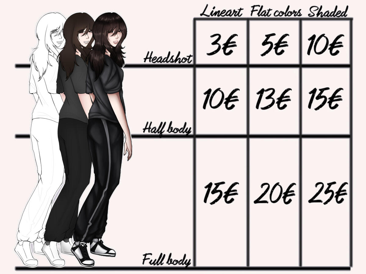 | ᯽Do's ' : OCxOC, CANNONXOC, CHIBI,ANIME OR GAME CHARACTERS, REAL PEOPLE , ANIMALS ᯽Don't: GORE, MECHA, FULL NSFW, REALLY COMPLICATED BACKGROUNDS OR HARD PERSPECTIVES ᯽Up to 3 people in a drawing ᯽For every character added 10€ ᯽Detailed background 10€ |
